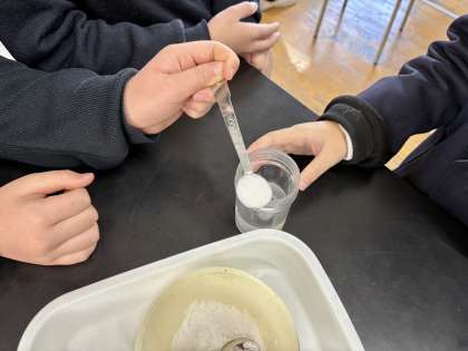 5年生は、身の回りのものが水にとける様子を観察し、その不思議さを探求しました。今回の実験では、食塩やミョウバンを水にとかし続けると、どこまでとけるのかを確かめるため、グループで協力して実験を行いました。