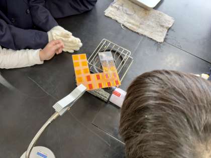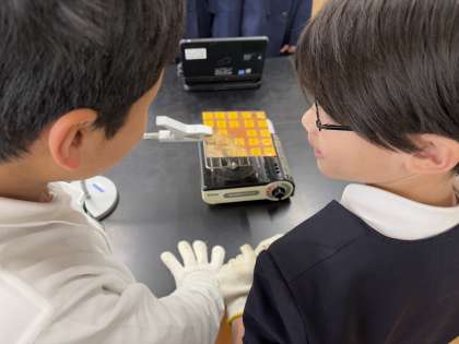 そして、実際にコの字型の金属板を温める実験を行いました。すると、熱はコの字型に沿って全体に伝わることが分かりました。子どもたちは、「熱は形に関係なく伝わるんだ!」「不思議だな!」と驚いていました。