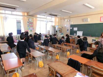 今回は授業中に不審者が校内に入った時を想定して実施しました。教室の中では、まず不審者に見つからないためにカーテンをかけ、電気を消して鍵をかけ、静かに廊下とは反対側に集まります。