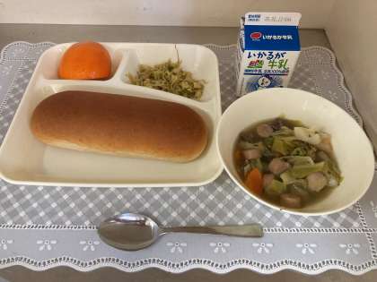 給食では牛肉やウインナー、じゃがいも、キャベツ、にんじん、パセリを使っています。