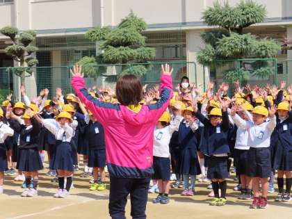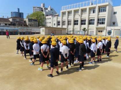 2年生が運動場に集まって、大きな声で歌を歌っていました。