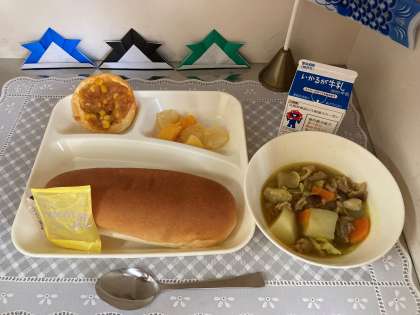 給食の変わりピザは、ぎょうざの皮に新食品の「乳なしチーズ」とツナ、コーン、ピーマン、ピザソースを混ぜ合わせた具をのせ、焼き物機で焼いています。