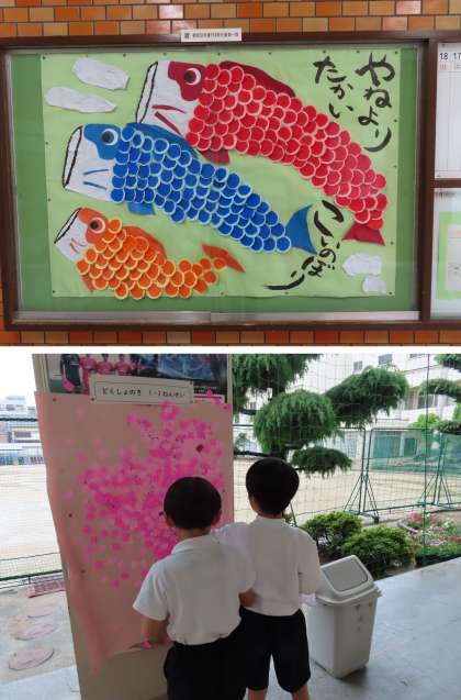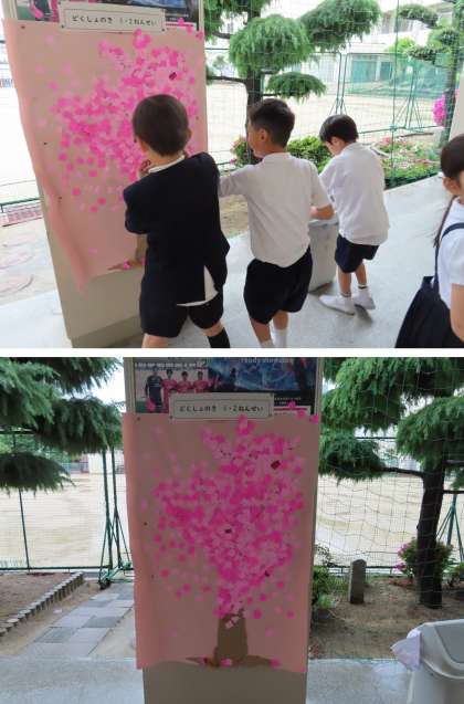 休み時間になると、花びらを付けにやってくる子どもたち。
