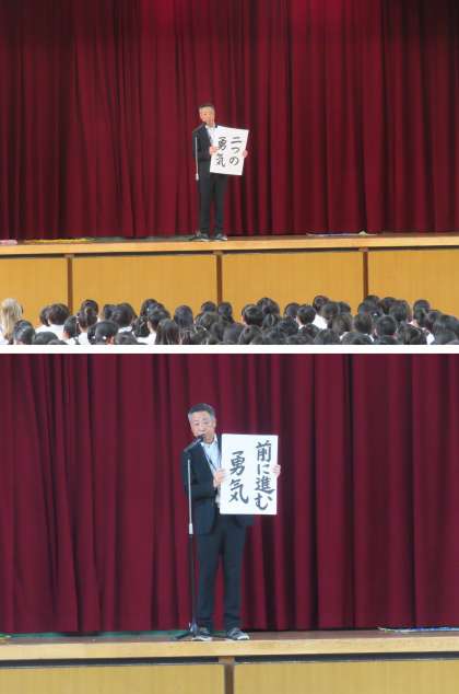 今日の全校朝会は講堂で行い、「二つの勇気」という話をしました。