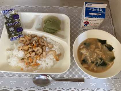 今日の「かやくご飯」には、鶏肉、ちくわ、にんじん、さんどまめが入っています。