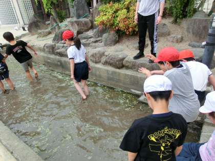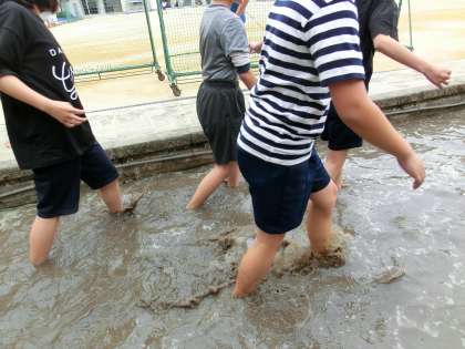 初めは泥に足を取られて戸惑っていた子どもたちも、少しずつコツをつかみ、「ぬるぬるして気持ちいい!」「昔の人はこうやって田んぼをつくっていたんだ」と、体験を通して多くのことを感じ、学んでいました。