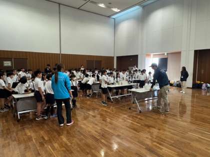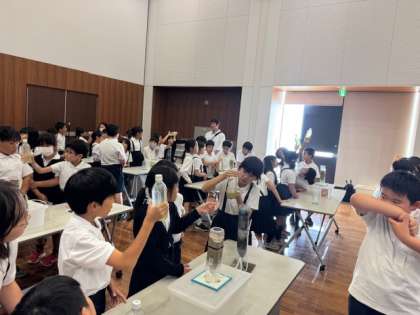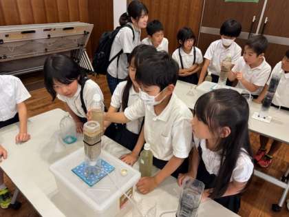 班ごとに、淀川の水がきれいになる様子を実験しています。