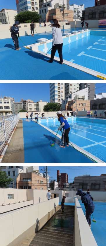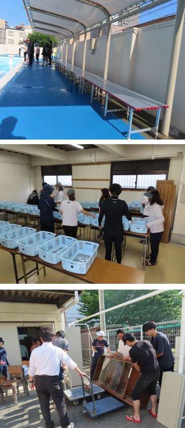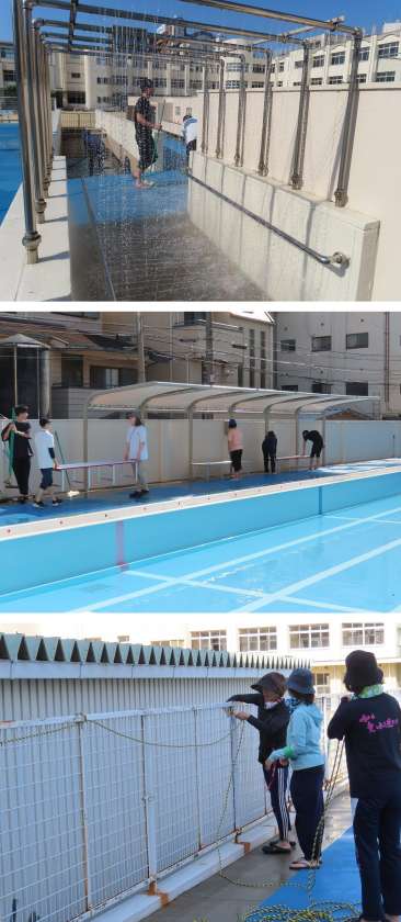 放課後には、教職員でベンチを置いたり、ロープを張ったり、更衣室の用意をしたりして、「プール開き」に備えました。
