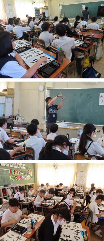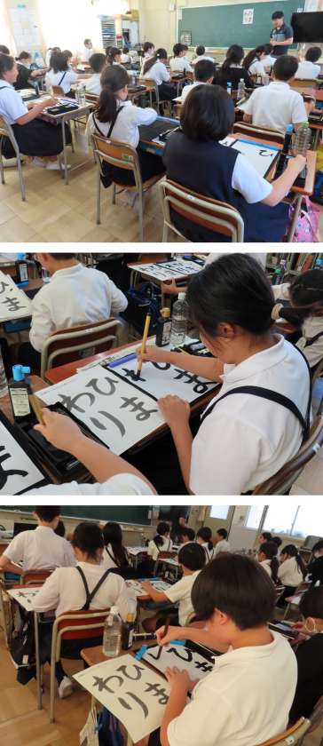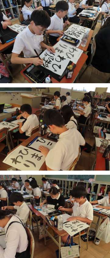 6年生が、習字の時間に『ひまわり』と筆で書いていました。