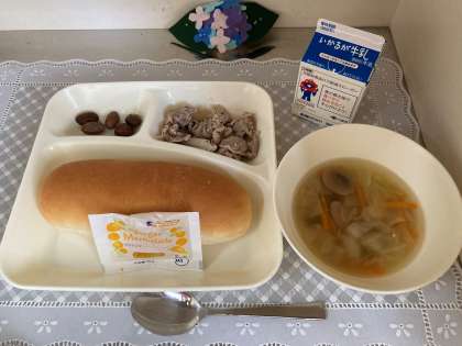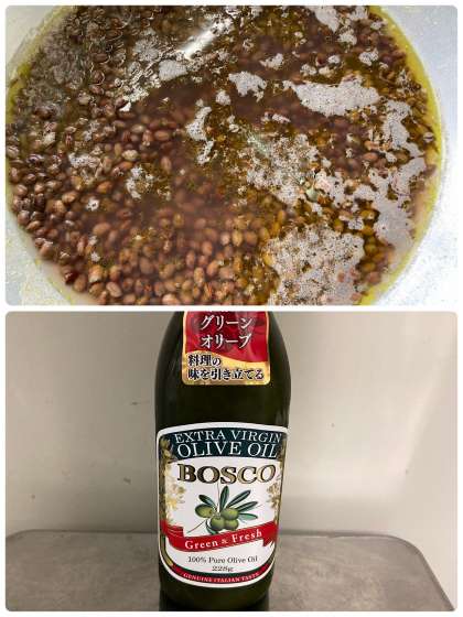 今日の給食の「うずら豆のグラッセ」は、バターの代わりにオリーブ油でつやを出しています。