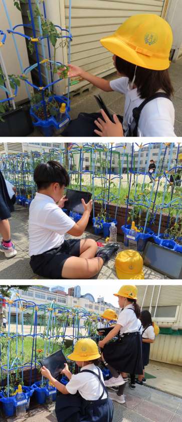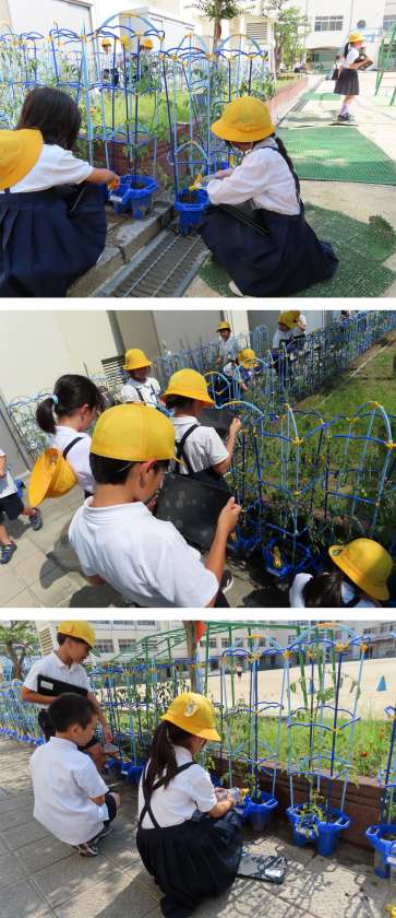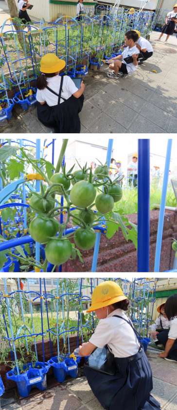 朝、2年生がミニトマトに水をやっていました。