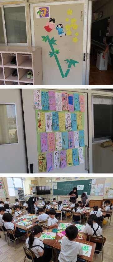 学校でもいろいろな場所で、七夕の飾りをつけたり願い事を掲示したりしています。