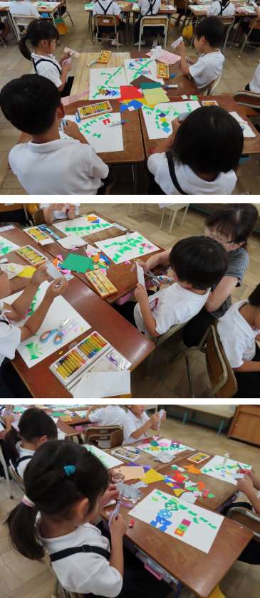 1年生が図工の時間に、折り紙で「天の川」を作っていました。