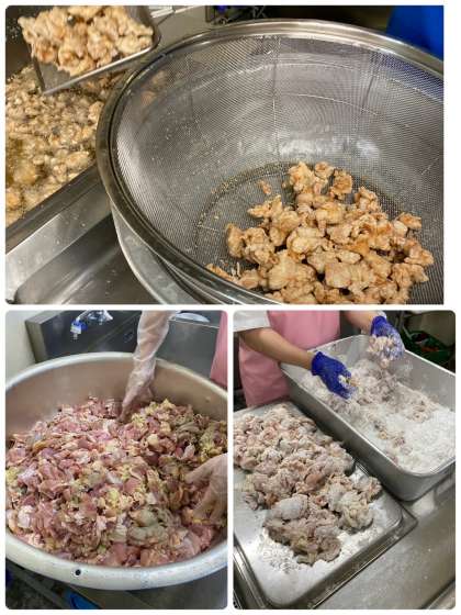 児童に大人気の「鶏肉のからあげ」は、しょうが汁、にんにく、塩、こしょうで下味をつけます。つけ汁を切り、でんぷんをまぶして揚げたら、カラッとジューシーなからあげのできあがり。大好評でした!