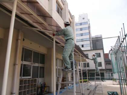 学校は、先生だけで成り立っているわけではありません。子どもたちの学校生活全般にわたって、安全で安心して生活できるよう、環境作りの面で中心となって活躍してくれているのが、管理作業員さんです。教室や校舎の保全、学習園や校庭の樹木の整備、学校やその周りの清掃など、本当に幅広く日々仕事を進めています。写真は、校舎に付属する「ひさし」の付け替えの様子です。これから暑い中での作業が続きます。