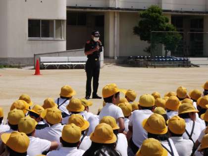 その後、消火器の使い方を消防署の方から教えていただき、みんなで実演を見ながら学習しました。1年生は特別に、学校へ持ってきていただいた消防自動車の見学もおこないました。ピッカピカに磨かれた消防自動車に子どもたちも大興奮。楽しい時間となりました。