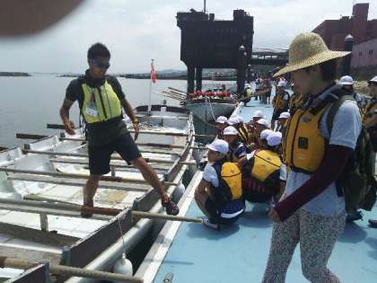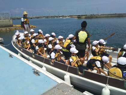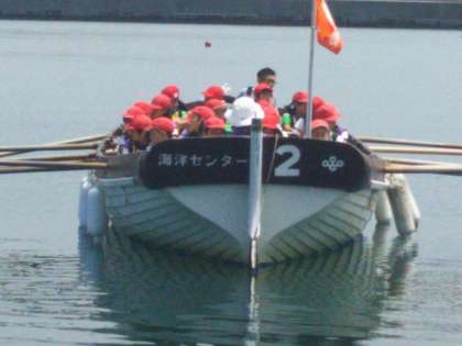 九時半に海洋センターにつきました。晴天、気温が28度。少し暑いですが、すぐに入所式を行いました。これから、ライフジャケットを着けて、カッター体験です。全員元気に活動してます。