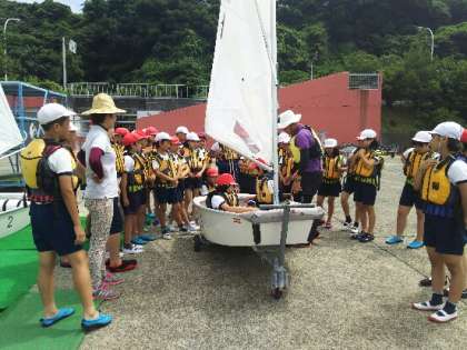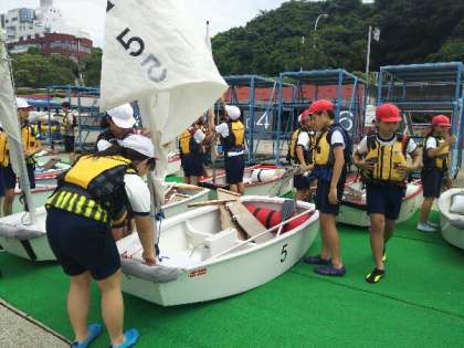 2時に二つ目の プログラムが始まりました。OPヨットです。16台のヨットをおろし、マストやブームを立て、ヨットを組み立てました。北風2mなので少し条件が悪いですが、海の上を滑るように漂っています。雲がきれ、日差しが出てきました。最高の海日和で、みんな楽しく活動しています。