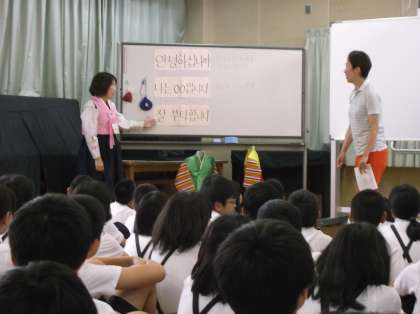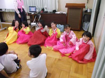 今日は、1・2・3・6年が外国の文化にふれる時間をもちました。1年生は「韓国・朝鮮の遊び」を、2年生は「はり絵」、3年生は「民族衣装」、そして6年生は「食文化」をテーマに取り組みました。子どもたちの発達段階に合わせて、今年も学年によって取り組み内容を工夫しました。