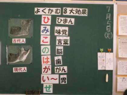 今日の栄養学習は、6年生でした。テーマは「噛むことの大切さ」です。古代の人や、戦国時代の武将、そして現代の私たちを比べると、食べるものが大きく変わっていく中で、食事にかかる時間も、そして噛む回数も大きく変化していることがわかります。特に噛む回数は、ずいぶんと減っているようです。栄養職員の先生が、噛むことの大切さをこんなふうに教えてくださいました。「ひみこのはがい〜ぜ!」。肥満を防ぐ、味覚が磨かれる、言葉の発音がよくなる、脳が発達する、歯が丈夫になる、癌を防ぐ、胃にやさしい、そして…」です。それぞれの頭の文字をつなげてくださいね。さて、ここで問題です。最後の「ぜ」は何でしょう? 正解は、何事も「全力」でできる!です。すばらしい授業、ありがとうございました。みんな、今日の給食、しっかり噛もうね。