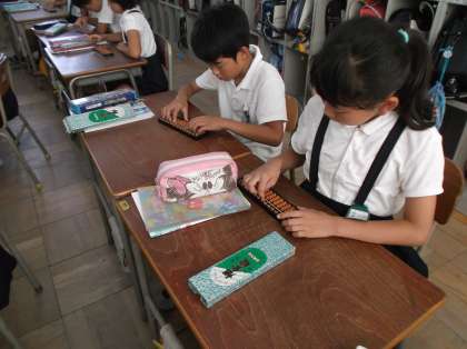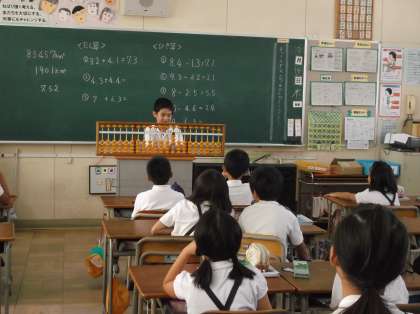 ICT機器の活用を図っている本校ですが、やはり場合によっては、昔ながらの大きな教具を用意して、授業をすることも大切だと考えています。写真に写っているのは、提示用の大きなそろばん。みなさんも懐かしいのではないですか。子どもたち一人一人にも実物のそろばんを配り、実際に先生と一緒にやってみる。そういう体験活動も大切です。そろばん教室に通っている子もいない子も、お互い教えあって授業は進みます。こういう教え合う関係ってすごく大切です。子どもの実態に合わせて、そして子どもが興味・関心を持てるよう工夫するのも担任の大切な役割です。