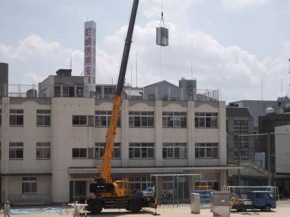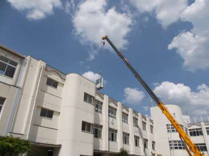 大きなクレーンが校庭に入り、クーラーの室外機が校舎の屋上に運び込まれていきます。また、教室では、クーラーが天井にセットされていっています。配管はまだまだですので、工事は始まったところですが、工事関係の方は、暑い中作業を進めてくださっています。この室外機のつり上げ工事のため、今日はプール開放ができませんでした。楽しみにしている子どもたちには、少しがまんしてもらっていますが、みなさん! 大きな工事でしょう。みんな、今日はお家でゆっくりしいるかな? 土曜日・日曜日の過ごし方をよく考えて、元気に月曜日のプール開放に来てくださいね。