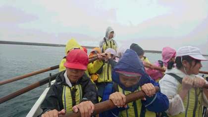 雨の中でしたが、全員でカッター体験ができました。乗組員の心がひとつにならないとうまく進みません。チームワークの大切さを学べました。次はお昼ご飯です!