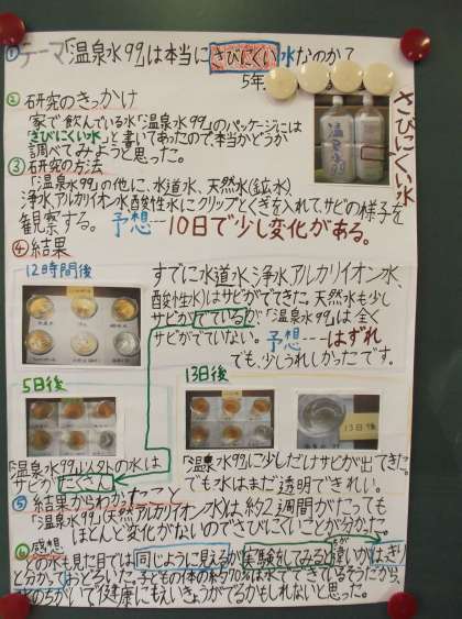 今年の夏休みも、たくさんの子どもたちが自由研究に取り組み、「学生科学賞」に応募してくれました。これは、府内の4年生以上の子どもが、理科学習に関する研究論文や記録ノート、製作物などを応募するものです。身近にある自然事象の中から、疑問に思ったことや調べてみたいことをまとめています。たとえば、雲や空のようすを時間を追って写真に撮り、その変化を調べた子や、バナナが時間がたつとどう変色していくかをていねいに観察した子、などなど…。子どもらしい発想で、でも予想を立てて、疑問を解決していくための観察や実験を行い、わかったことをまとめていくという問題解決学習の思考を大切にしながら取り組んでいました。時間もかかるだろうし、準備もたいへんだったと思います。でも、普段できないことに取り組むことができるのが夏休み。きっと、大きな成果をつかんでくれたことと思います。提出してくれたみなさん! たいへんよくできました。花マルです!