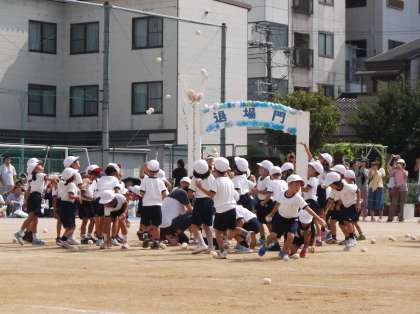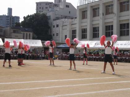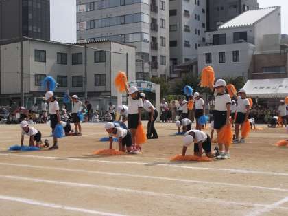 午後の部の演技や競技の紹介をします。午後は、応援合戦から始まりました。その後、4年生の団体演技「素直な気持ちで伝えよう!」。そして1年生のかわいい「チェッコリでたまいれ」と続きます。お天気もよくなり、少し暑くなってきましたが、お家の方が作ってくれたお弁当をお昼に食べ、元気モリモリがんばっています。