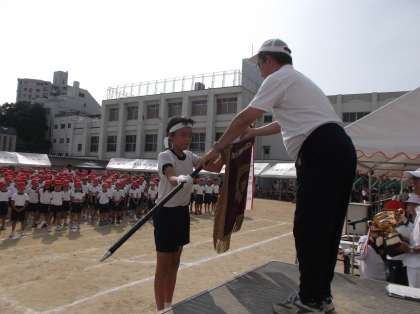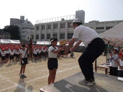 とうとう閉会式になりました。まず、得点発表です。今年の優勝は…。白組でした。盛り上がる白組のみんな。あたたかく拍手をおくる赤組。悔しかったでしょうが、赤組のみんな、素晴らしかったですよ。「きずなを深める運動会」というめあてが達成できてよかったです。大きな事故やけがもなく、みんなが全力を出してがんばれた運動会となりました。校長先生から「みんなよくがんばりました。」という言葉をもらって、今年の運動会は終わりました。また、その後の片づけは、保護者の方にたくさん手伝っていただき、そちらも無事終了しました。ご参観いただいた来賓の方々、普段からいろいろ子どもたちの安全のためにご尽力いただいている地域の方々やPTAのみなさん、本当にありがとうございました。