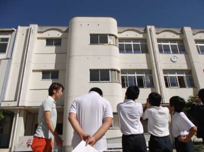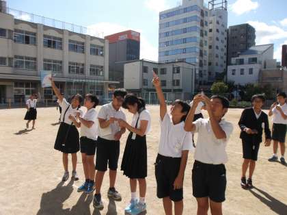 6年生が運動場で分度器を持って何か測っています。さて、何をしているのでしょうか? 実は「拡大図と縮図」の学習で、校舎の目印のところの高さを測っています。このように実際に体験していく学習は、この学齢の子どもたちにとってはすごく大切な活動になります。で、正解は8.99mです。教室で、実際に縮図を書いて計算してみた子どもたち。何と6cmの誤差で計測した子どもたちがいたそうです。なかなかやりますね。ちなみに、3枚目の写真が教科書の問題です。みなさんも、お近くの建物の高さを測ってみませんか?