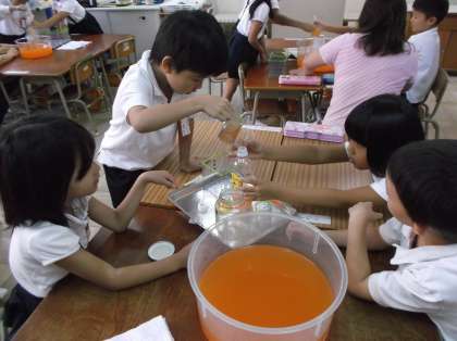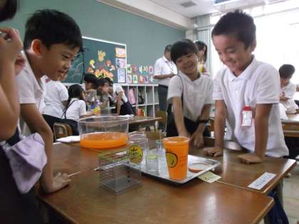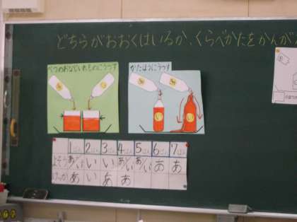 算数の学習で、長さや体積についての感覚を豊かにすることは、特に低学年の場合大切です。写真は1年生の算数の学習のようすです。体積について、直接比べたり、別のものに移し替えて比べたりする活動を通して、体積も数字で表すことができるのではないかという見通しを持つ学習をしています。どちらが多いか予想を立てて、実際にジュースに見立てたものを別の容器に移し替えて調べています。予想通りになって思わず笑顔があふれる子どもたちの顔は、本当にうれしそうです。こういう学習の積み重ねが、将来の抽象的な学習につながるのですね。