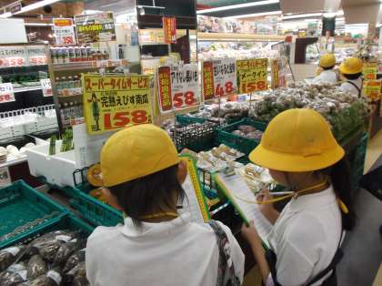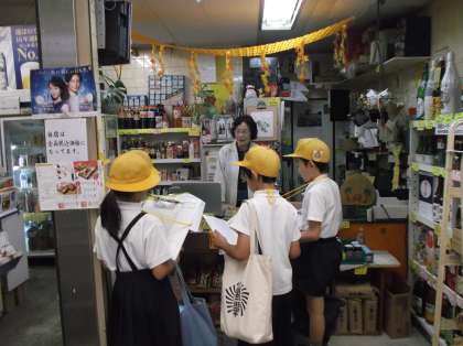 3年生の子どもたちが、商店街・コンビニ・スーパーマーケットの見学を行いました。お店で働く人々に視点をあて、働く人々やお店の工夫や努力、願いをとらえるだけでなく、お買いものに来たお客さんへのインタビューも行いました。事前に一生懸命練習したのでしょう。取材させていただくときのあいさつも上手に声をそろえてできました。どのお店の方も、おいそがいしいにもかかわらず、丁寧にそして親切に答えてくださいます。「商品の種類は何種類ありますか?」、「いつ頃からお店を開いているのですか?」や「お店の自慢は何ですか?」などなど。子どもらしい質問もあれば、「お店の前に分別用の箱が置いてある。」「ベンチがあるよ。お年寄りが休む時便利だね。」など、お店の工夫もちゃんと発見していました。商店街のみなさん、コンビニ(ローソンさんです。)、スーパーマーケット(ビス昭南さんです。)、そして通りがかりのやさしい買い物客のみなさん。どうもありがとうございました。