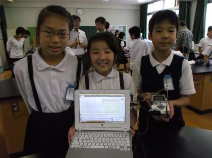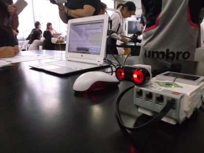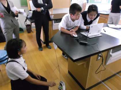 2020年度から始まる新学習指導要領の特徴の一つに、「プログラミング教育の必修化」があります。本校では、特色ある取り組みの中で、プログラミング学習を取り入れた授業の実践を行っています。写真は、5年生の理科「ふりこのきまり」の授業の様子です。この単元の学習では、プログラミングをして実験を行い、得られたデータを読み取って処理し、結果を導出する学習を行います。授業では、レゴマインドストームを振り子として使用し、振り子の周期の波形をデータとしてパソコンに送ります。その結果、今までは数値しか残らなかったものが、周期を画面上で波形として見ることができるようになったのです。