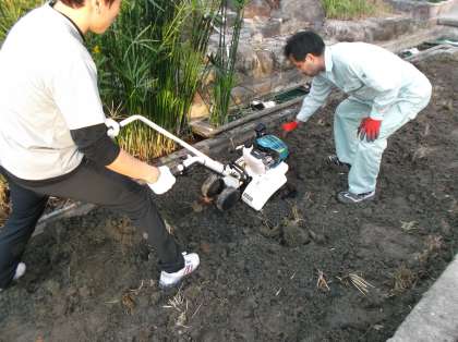 先日、5年生の子どもたちが稲刈りをしました。刈った稲は、今、干しているところです。稲も大切ですが、土も大切です。来年に向けて、土おこしをしました。写真は、学校の耕運機で土をおこしているところです。来年の5年生の学習の準備です。何事も準備が大切です。