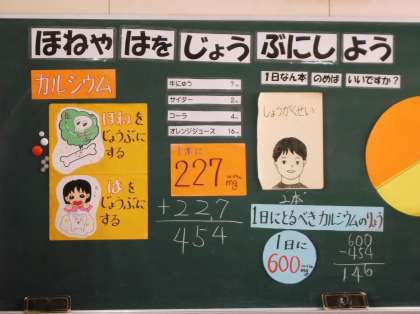 2年生の栄養についての学習の今日のテーマは、「骨や歯をじょうぶにしよう!」です。必要な栄養は、何と言ってもカルシウムですね。で、カルシウムが多く含まれている食品はと言うと…。そう、牛乳です。給食では必ず牛乳がでます。牛乳1本には、何と227mgものカルシウムが含まれています。一日に必要なカルシウムは、約600mg。小学生なら2本。おとなで1本半。お年寄りで1本飲むといいそうですが、それでも600mgにはたりません。では、どうするか?そうです!牛乳以外の食品で摂取することが大切です。たとえばヨーグルト・チーズ、小魚や大豆、ワカメといったもので補う必要があります。アレルギーで牛乳が飲みたくても飲めないお友だちもいます。授業では、アレルギーのことについても学習しました。好き嫌いせず、何でもバランスよく食べるよう心がけていってほしいものです。2年生のみなさん、牛乳をしっかり飲みましょうね!