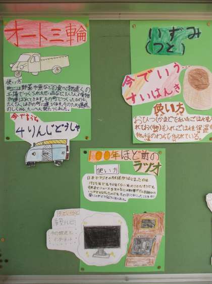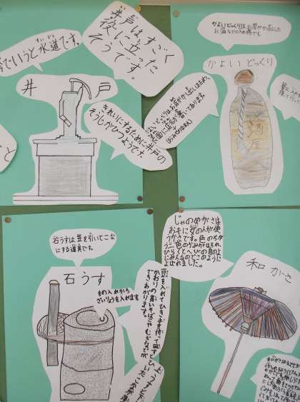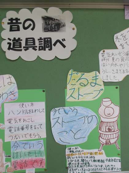 先日このホームページでご紹介した3年生の社会科の学習、「昔の暮らし」。覚えておいででしょうか? 七輪を使って火をおこし、おせんべいを苦労して、でもおいしくいただいたあの学習を。その後、子どもたちは自分たちが興味を持った「昔の道具」をいろいろ調べました。そして、それをグループに分かれて、絵や文章で表現し、他の学年のみんなにも知ってもらうために一階職員室前廊下に掲示したのです。今日はそれをご紹介します。絵は道具の特徴をとらえていて、上手に表現しています。また、ていねいに細かいところまで説明の文章がついています。ぜひ、学校へ来た際、ご覧になってください。(じっくり見ていると、自分の小さかった頃の昔を思い出してしまいました。子どもの頃、使っていたものもありました。懐かしいなぁ…。)