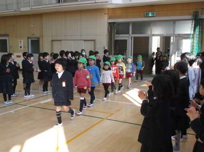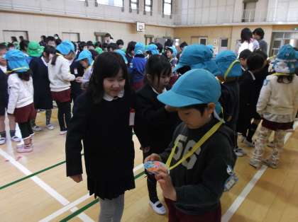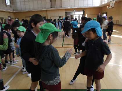 就学前の子どもたちが小学校入学にあたり、少しでも不安をなくすように、そしてスムーズに小学校生活がスタートできるように願い、1年生の子どもたちが交流会を準備しました。1年生の子どもたちが講堂でお出迎え。一人一人が幼稚園や保育所のお友だちと手をつなぎながら入場します。司会のお友だちの合図で、歌を歌ったりじゃんけん列車のゲームをしたり…。小さいお客さんたちに少しでも楽しんでもらおうと、やさしく声をかけています。ちょっと前まで幼くて、給食の食器を運ぶのも危なっかしい1年生の子どもたちが、今日は少しお兄ちゃん・お姉ちゃんになっていました。楽しい時間はアッという間です。終わりの言葉で無事終了しました。小さなお友だちからお礼を言われて、うれしそう。1年生の子どもたちにとっては、大きな自信となった大切な行事となりました。