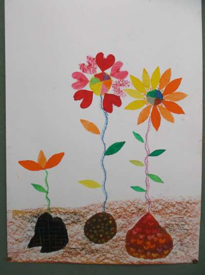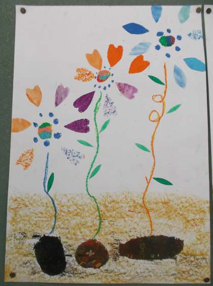 今日は、1年生の図工の作品をご紹介します。題して「ふしぎなたねからうまれたよ」です。子どもたちがそれぞれ思い描いた「たねからうまれた」お花を表現しました。型がみを切り抜いて、そこを思い思いの色でぬっていきます。自然とできたグラデーションがきれいにできあがりました。一人一人の感性が生きた作品となりました。外はまだまだ寒い日が続きますが、教室の中は、まるでお花畑のようになりました。一足先に春が来たようです。作品のほんの一部をご覧ください。