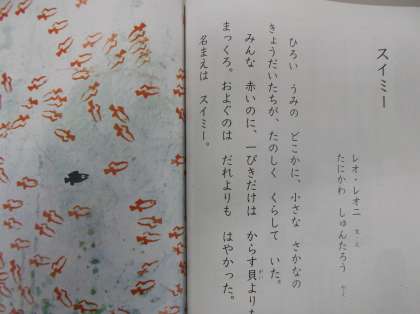 絵本作家のレオ・レオニさんの作品で、谷川俊太郎さんが訳した「スイミー」が1年生の教科書に載録されています。きょうだいみんな赤い魚だったのに、スイミーだけが真っ黒な魚でした。きょうだいたちが一匹残らずまぐろに飲み込まれたけれど、泳ぎが得意だったおかげで、食べられずにすんだスイミー。海を旅するうちに、まぐろにおびえながら暮らすきょうだいに出会い、自由に海が泳げるようにみんなで協力して大きな魚を追い払うことを考えます。さて、どうしたのでしょうか…?「そうだ、ぼくが、目に なろう。」