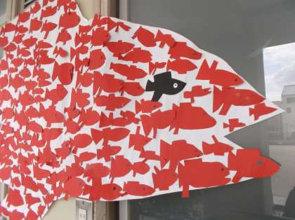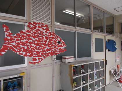 大きな大きな赤い魚を、1年生の子どもたちがクラスみんなで作りました。一人の力は小さいけれど、みんなで力を合わせればこんなにも大きな力になる。何度も何度も声に出して読んだ作品を表現しました。ぜひ、ご覧ください。