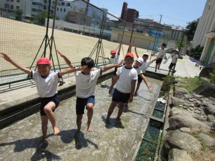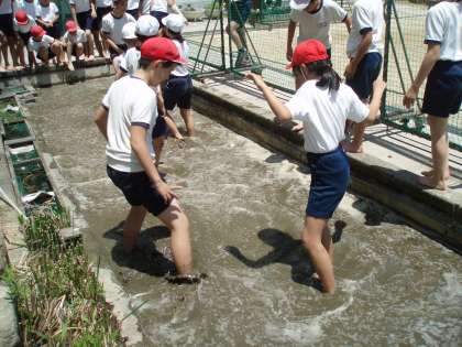 水がはられた苗代田に、素足で入りみんなで「代かき」をしました。ぬるぬるした泥の感触を気持ちいいと感じる子もいれば、気持ち悪い〜と感じる子もいるなど反応は様々です。中には、土特有のにおいに、思わず鼻をつまんでしまう子もいました。みんなで協力して、足でしっかり土をかきまぜて、代かきを終えました。