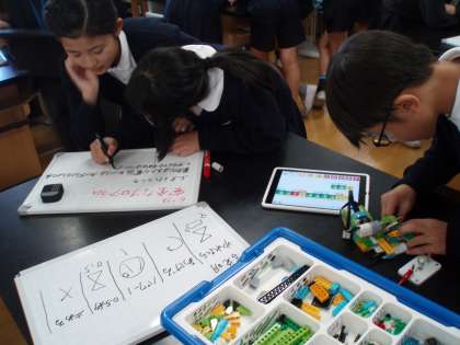 子どもたちはグループの友だちと協力して、とても熱心に課題に取り組んでいました。大阪市の先生方も多数来られ、苗代が取り組んでいる実践を参観されていました。今後もプログラミング的思考を他教科にも活用し、取り組んでいきます。