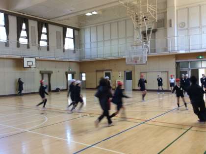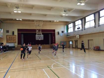 6年生も大阪エヴェッサのみなさんとバスケットボールの学習をしました!6年生ともなると後半に行う試合(もちろん大阪エヴェッサ2名VS苗代小学校10名)は迫力満点。古藤先生(2枚目の写真の手前:写真がぶれて見えにくいですが…)も走りました!!!!