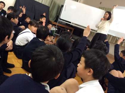 「自分が持っているボールを1年生に投げるとき、どんなことに気を付けて投げるかな?」LINEのスタッフの方は、子どもたちに実際のボールを使ってキャッチボールをするよう促しました。「相手が受けやすいように、優しく投げえる。」と言って子どもたちは相手にそっとボールを投げていました。「それと同じで、メールを送るときも相手のことを考えてあげてね。」とLINEのスタッフの方は、キャッチボールでの経験を通して、子どもたちに相手のことを考える必要性を実感させてくれました。
