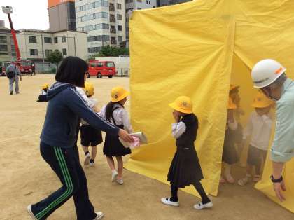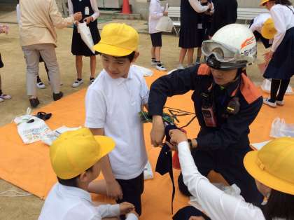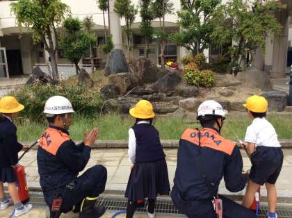 本年度は避難訓練の後に、区役所、消防署、地域のみなさんと防災訓練も行いました。1・2年生は「煙体験」、3・4年生は「消火体験」、5・6年生は「応急処置訓練」をそれぞれの場所に分かれて行いました。何度も訓練を重ねることで、緊急時どうすればよいのか考えることができます。これからも、続けていきます。