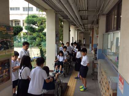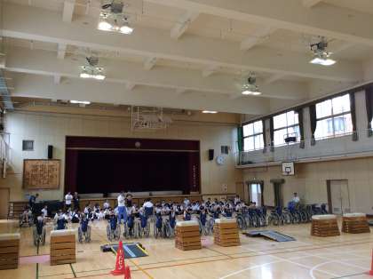 ゲストティーチャーを招いて、5年生は車いす体験をしました。車いすには使う人の用途に応じてさまざまな種類があります。今日は実際に持ってきていただき、子どもたちが試乗して、違いは何か体験することができました。