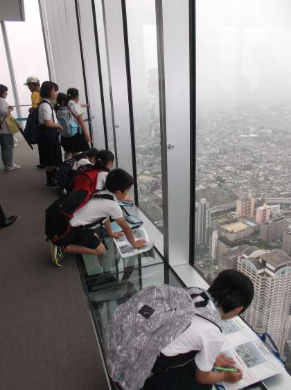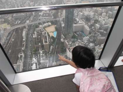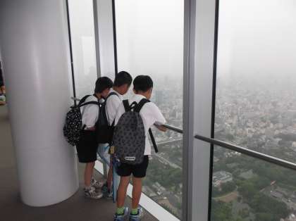 上から見る世界はとてもおもしろく、「先生、電車がへびみたいだよ!」「町が小さく見える!」などたくさんの発見もあったようです。真下が見える透明のパネルの上にこわごわ乗る子、平気で乗る子、絶対乗らない子、それぞれでしたが、みんな楽しめたようです。お家で子どもたちのお話を聞いてあげてくださいね。