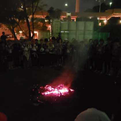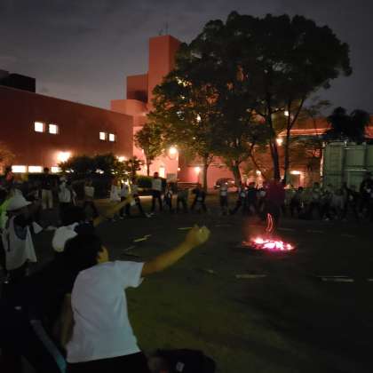 キャンプファイヤー最後は、お風呂の入り方レクレーションを海洋センターの方からレクチャーしてもらい、子どもたちは海洋センターのお兄さんの声に合わせて「幸せなら手をたたこう」を歌って踊りました。