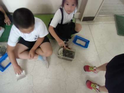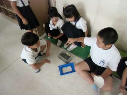 2年生は学習の一環の一つとしてザリガニを飼っています。グループごとに1匹、大事に育てています。それぞれに名前もついているんですよ。みんなで協力してお世話をしています。